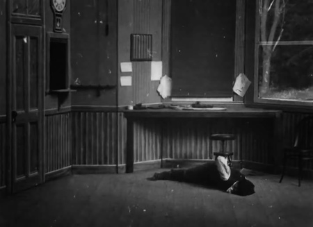 В фильме «Крадущая рука» 1908 года композиция также подчёркнуто театрализована. Большинство кадров строится вокруг центральной оси, к которой тяготеют персонажи и ключевые предметы.
