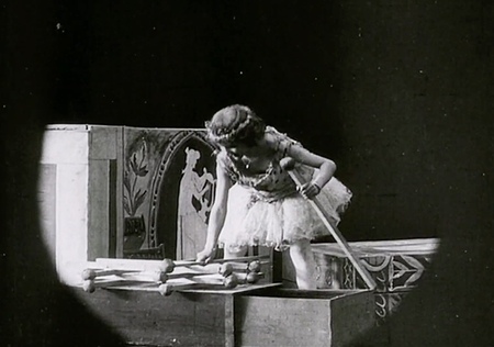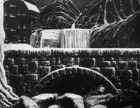 В «Джеке и бобовом стебле» это проявляется особенно точно. Декорации фильма становятся не просто интерьерными комнатами, а целыми фантастическими мирами: огромный стебель, по которому поднимается Джек, миниатюрные домики, интерьеры гигантского замка. Камера фиксирует их фронтально, как на театральной сцене, но сам масштаб и конструкция пространства создают ощущение движения в трехмерном мире, несмотря на плоскую съемочную плоскость.