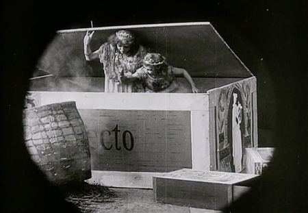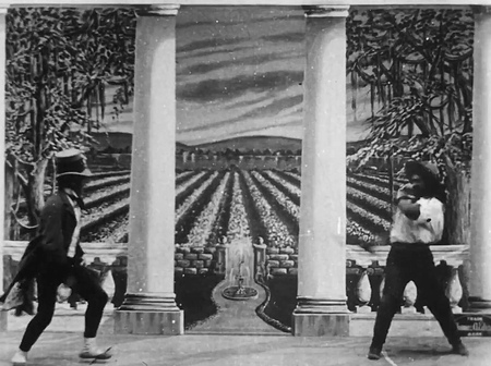 Пространство кадра конструировалось по тем же принципам, что и театральная сцена конца XIX века: декорации выступали не репрезентацией реального мира, а условным декоративным окружением, которое дополняло действие.