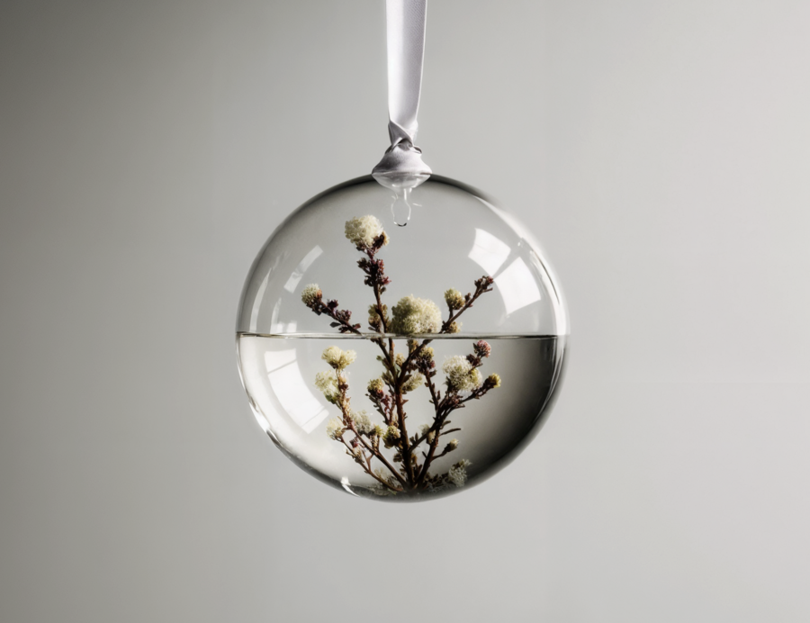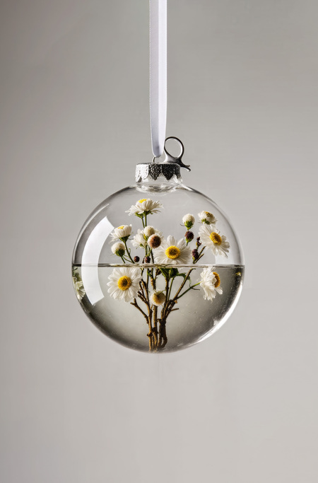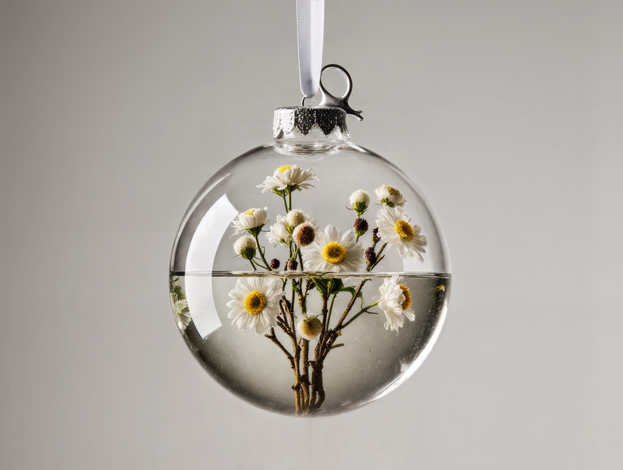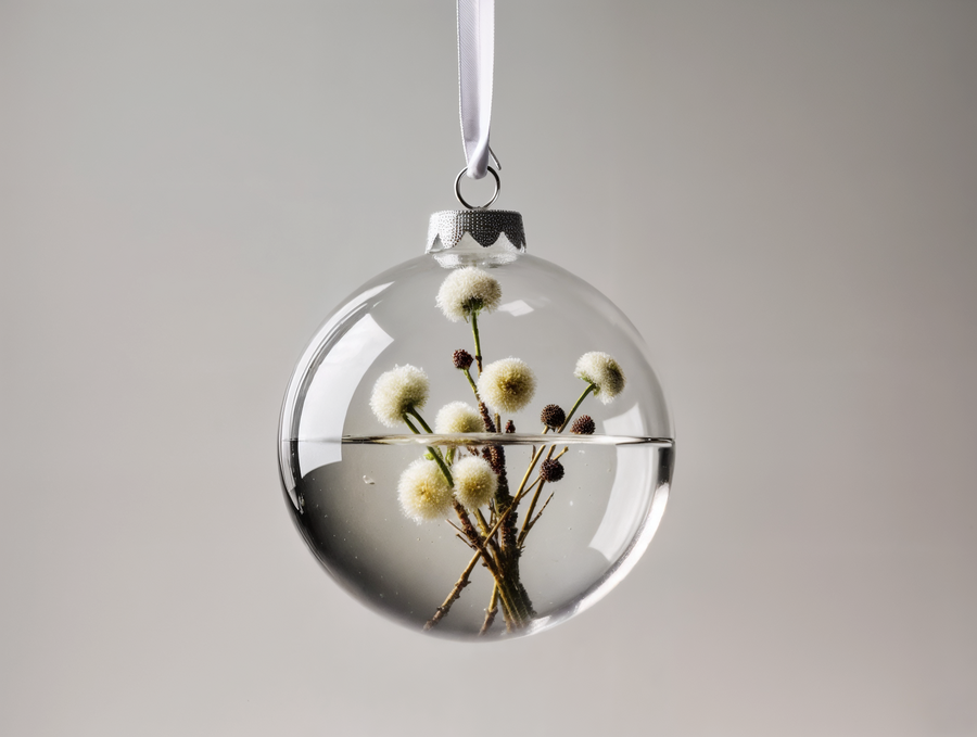 Елочные игрушки из эпоксидной смолы диаметром 8-10 см с цветочными композициями внутри. Эти элементы аккуратно расположены внутри прозрачной смолы, создавая эффект замороженной природы.