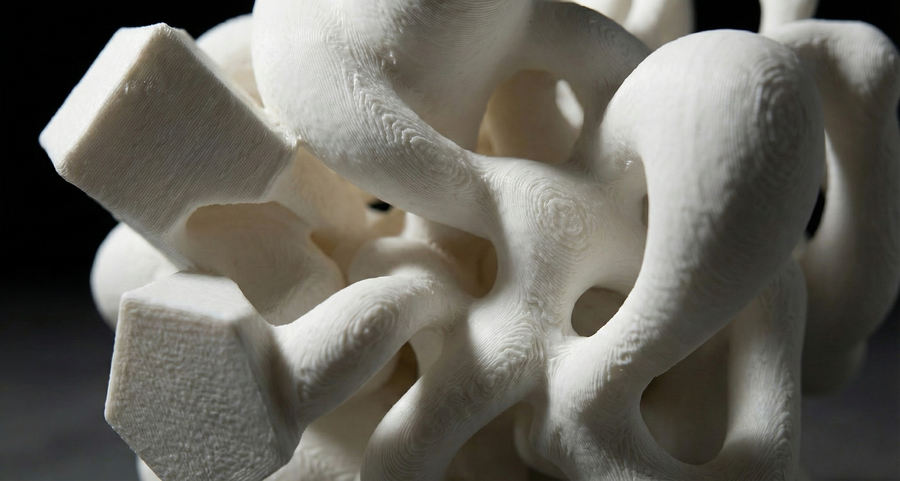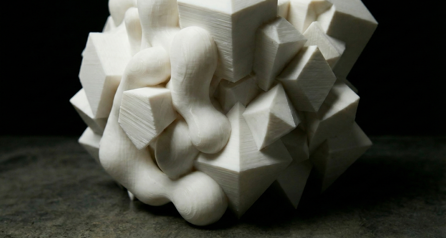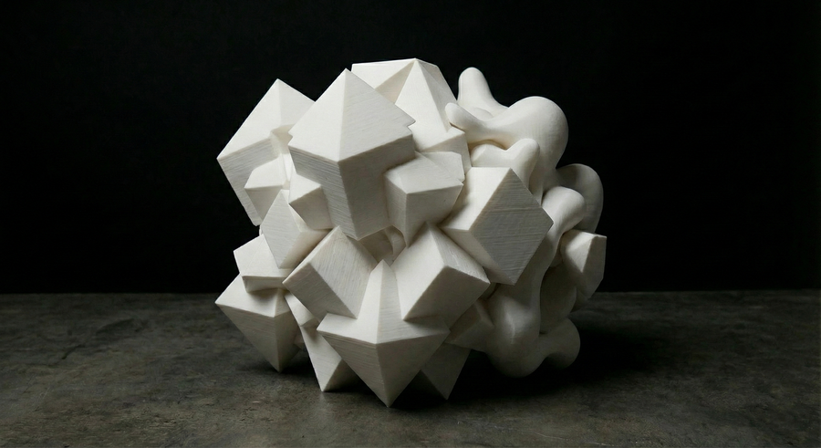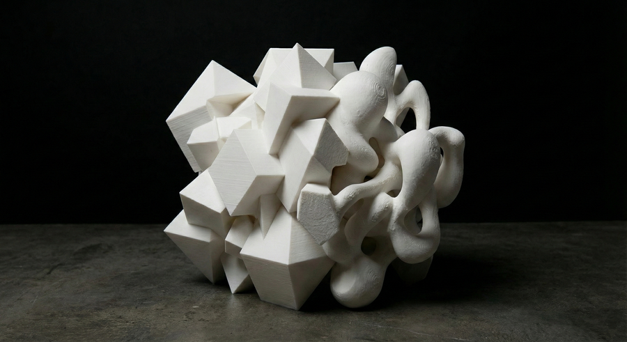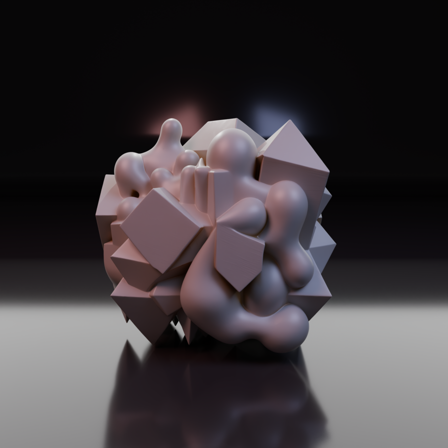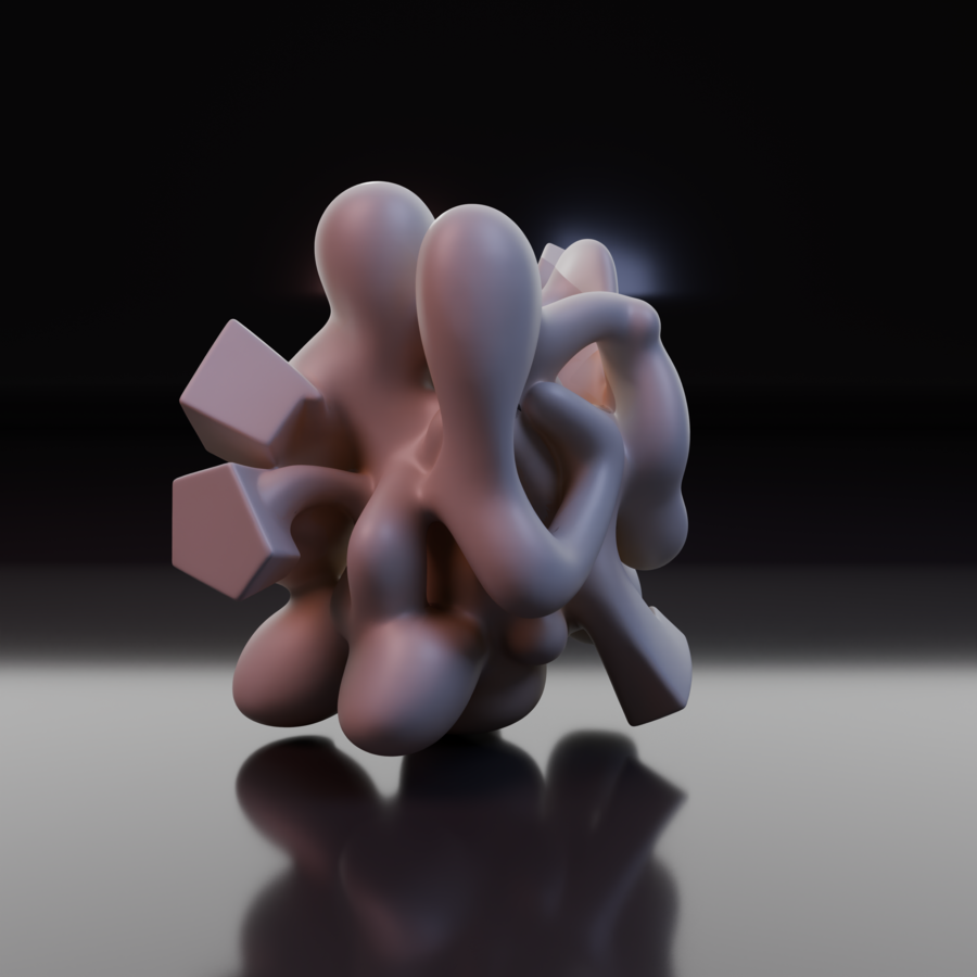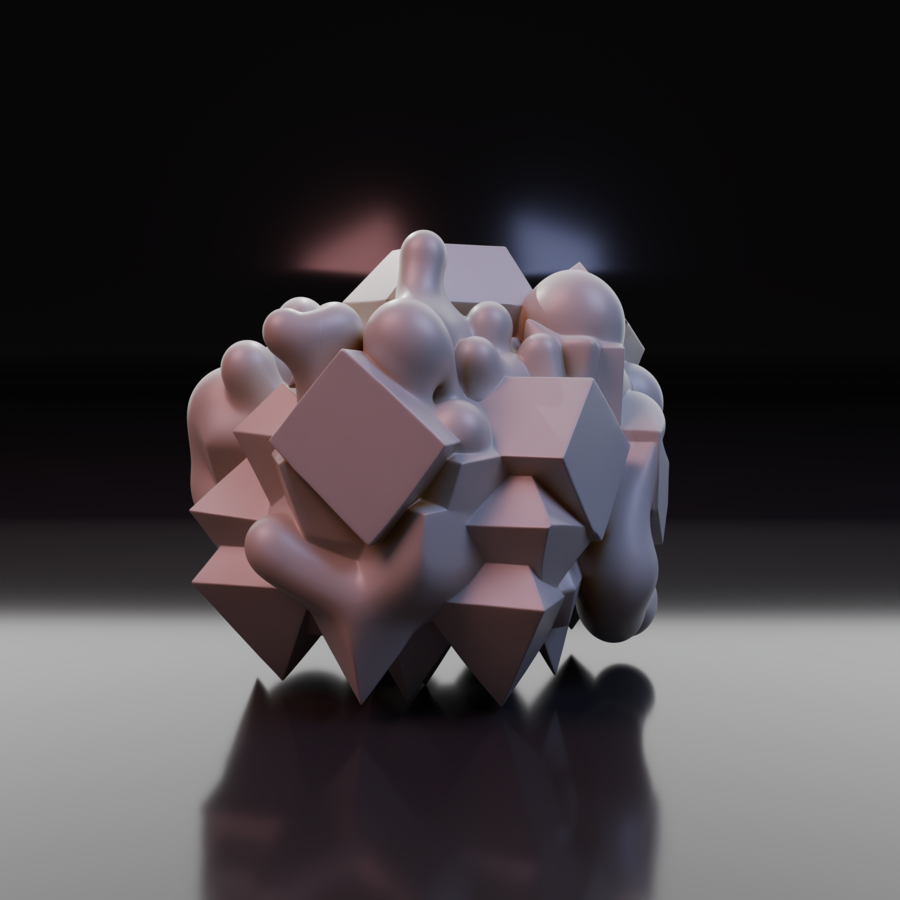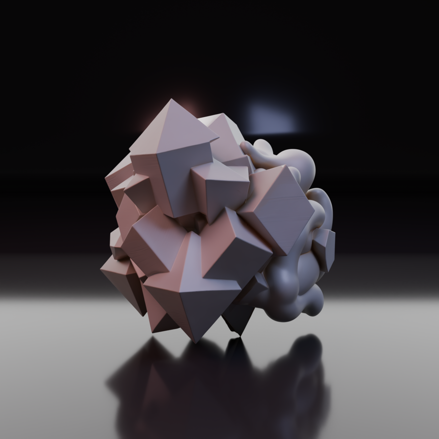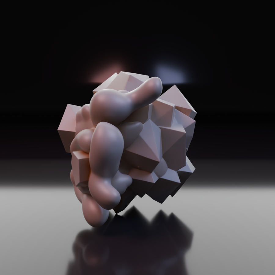 Объект IV: «Поглощение». Хаос доминирует. Острые углы остались лишь как «кости» или руины внутри мягкой, биоморфной оболочки. Геометрия выглядит как инородное тело, которое переваривается органической массой. Форма становится непредсказуемой.