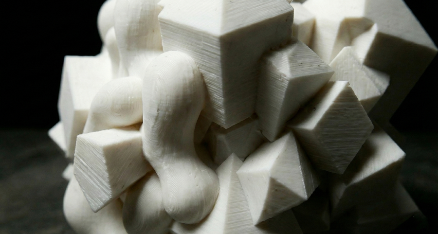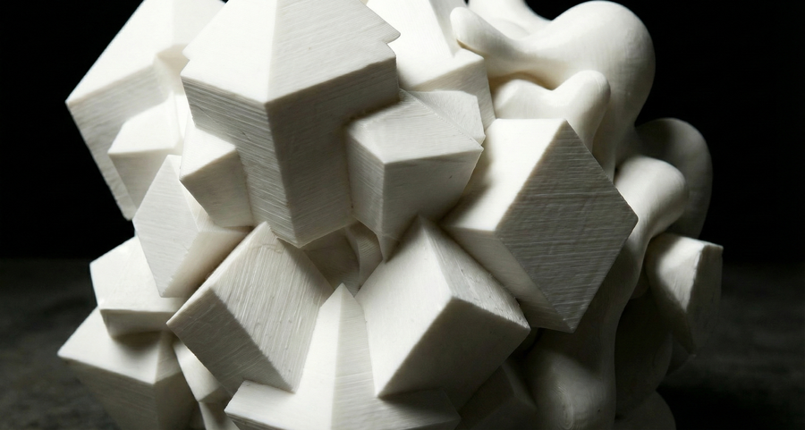 Объект III: «Симбиоз». Точка невозврата. 50% геометрии и 50% хаоса. Кристаллические формы словно тонут в вязкой, текучей массе. Создается визуальное напряжение: кажется, что объект дышит. Зритель видит борьбу двух состояний вещества — твердого и жидкого.