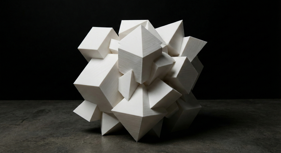 Объект I: «Кристаллизация». Чистая структура. Острые грани, идеальные кубы и пирамиды, пересекающиеся под математически выверенными углами. Это метафора человеческого разума, логики и созданных структур. Здесь энтропия минимальна. Система стабильна и предсказуема.