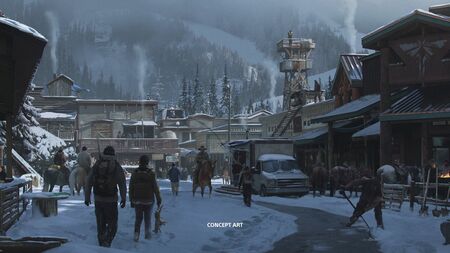 Яркое дневное освещение подчеркивает идиллическую эстетику, создавая мощный контраст с мрачным внешним миром, где мародерствуют криминальные группы и бродят ожившие мертвецы. Вечером пространство заполняется теплым светом окон и уличных фонарей. Общественные сады, школа, мастерские и система водоснабжения демонстрируют прогресс от простого выживания к устойчивому развитию.