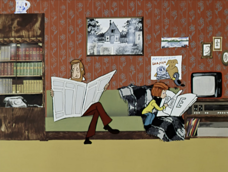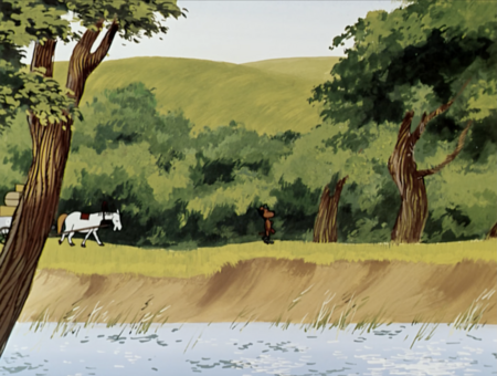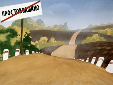 Фоны этого цикла отличаются многоплановостью и вариативностью цветовых переходов. Они создаются ручной росписью на ячейках целлулоида, что придаёт изображению естественную неоднородность и текстурность. Переходы цвета на земле, траве, небе создают ощущение объёма и глубины, формируют атмосферу «живой» среды.«Трое из Простоквашино»(1978 г.), реж. Владимир Попов