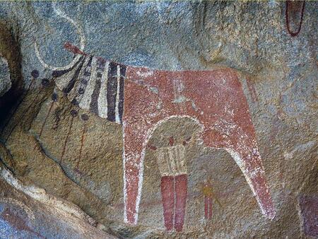 Ярким примером являются наскальные росписи Африканского Рога, созданные около 5000 лет назад, они запечатлели становление развитой скотоводческой культуры. Основу изобразительного ряда составляют сцены с коровами, собаками, жирафами и ритуально одетыми людьми. Ключевой особенностью является изображение животных с декоративными элементами — белыми полосами на шее и спине, что указывает на: · Сакральный статус скота в обществе · Возможное отображение хозяйственных практик (доение) · Элементы культа крупного рогатого скота.