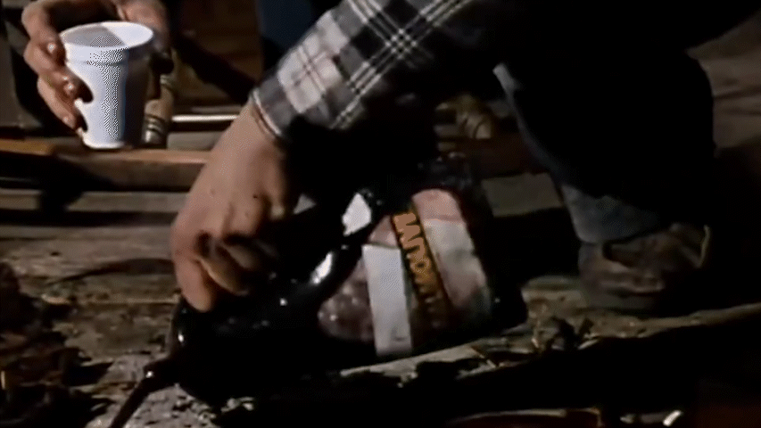 Кадры из «Documentary- THE EVIL DEAD.- 1981- BEHIND THE SCENES». Использование шланга для имитации льющейся крови из рванной раны