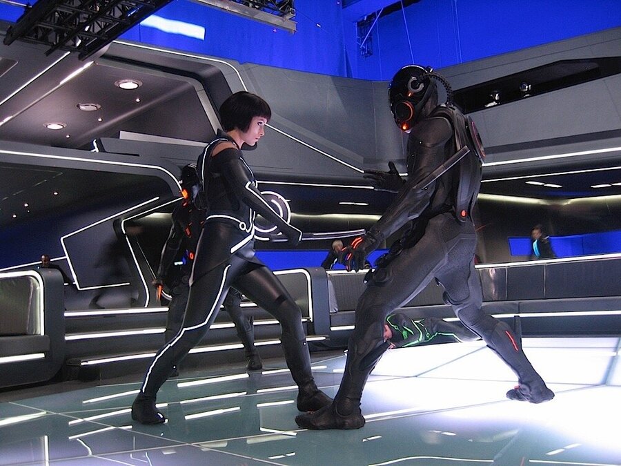 Использование хромакея в «Трон: Наследие» не стало главным техническим прорывом проекта. Blue screen здесь — привычный инструмент, но несмотря на стандартность технологии, картина поражает тем, насколько убедительно переданы блики, отражения и светоотражающие поверхности, которых в реальности на съёмочной площадке просто не существовало и которые никак не взаимодействовали с актёрами. Обычный хромакей используется так мастерски, что цифровые элементы кажутся частью реального окружения.