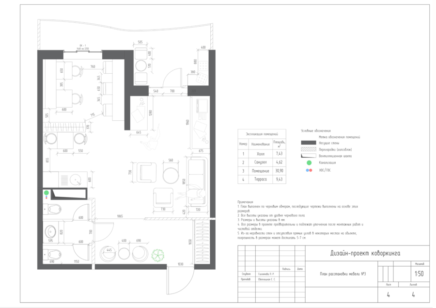 Функциональное зонирование, обмерный план, план расстановки мебели