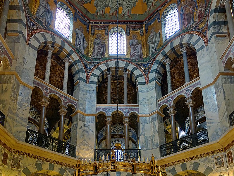 Это центрического типа (8-угольник, заключенный в 16-угольник) дворцовая капелла. Для ее декора использовали облицовочные материалы дворца Теодориха. Архитектором является Одон из Меца — франкский мастер. Особенности сооружения: 1. Двухстворчатые бронзовые врата; 2. Внутренний восьмигранный свод диаметром 14,5 м, высота — 31,7 м.; 3. Демонстрация приемственности Римской империи — античные колонны и мрамор, привезенные из Рима и Равенны; Вывод: сочетание римской кладки, византийского купольного свода и западноевропейских конструктивных решений.
