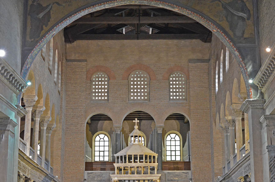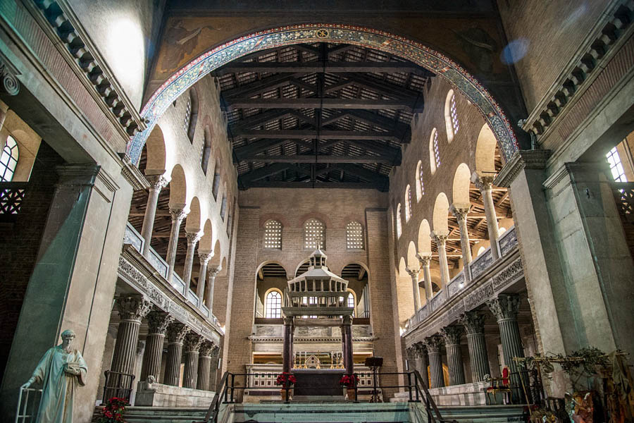Базилика — прямоугольное сооружение с алтарной частью на востоке и входной группой на западе, разделенное рядом колонн на три или пять частей. В главном помещении ритм колонн напрявлял взор прихожанина к алтарю — апсиде, где рассполагалась алтарная часть. Центральный неф был выше боковых, завершался триумфальной аркой и освещался окнами.