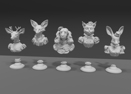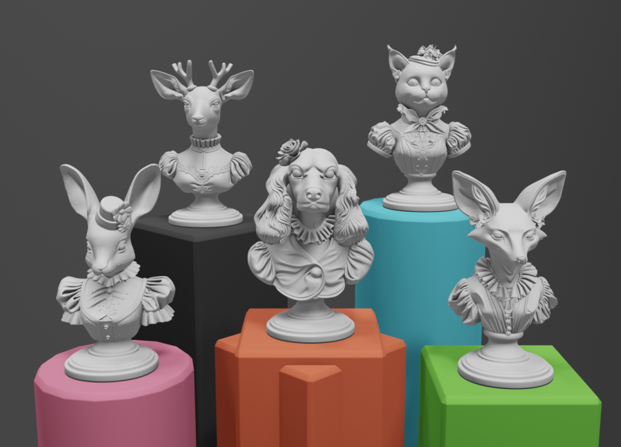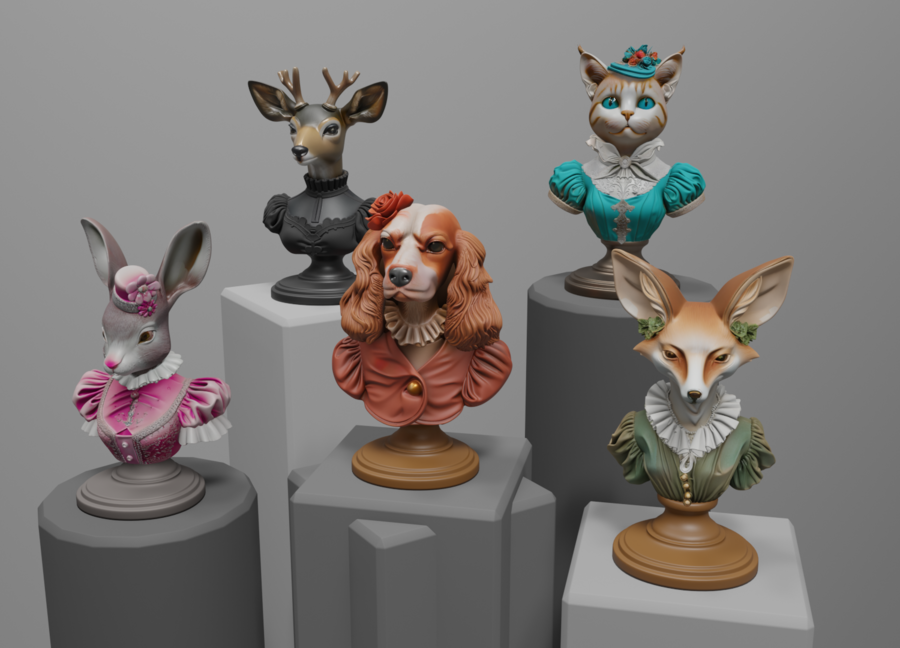 Серия DIY бюстов для росписи в виде животных в винтажных платьях. Модели сделаны с использованием генеративных нейросетей и подготовлены к 3D-печати.