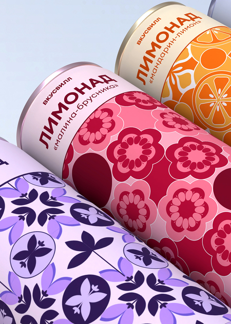Упаковка лимонадов для бренда ВкусВилл вдохновлена метафорой «калейдоскоп вкусов». Концепция основана на уникальных паттернах, каждый из которых образно отражает компоненты из состава лимонадов.