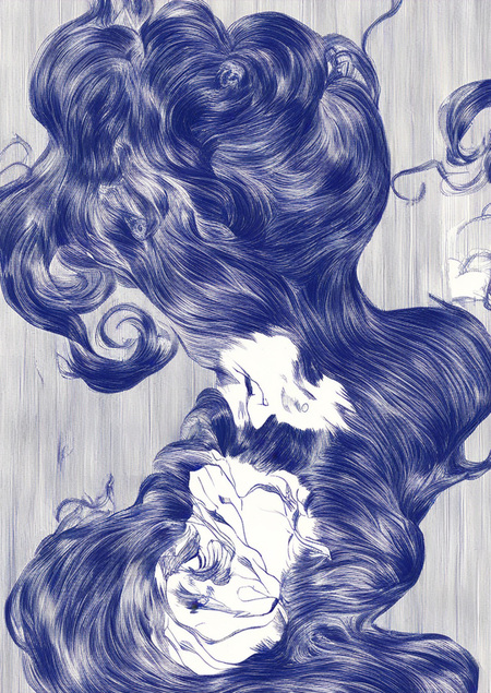 drawing in Sveta Mullari style, ink sketch, elegant line art, thin and thick lines, detailed hair texture, subtle shadows