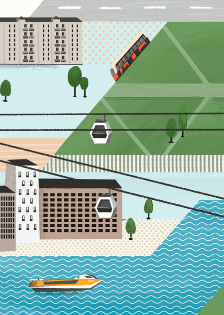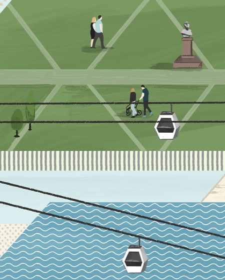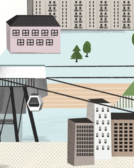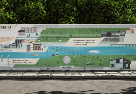 Все пространство, через которое простилается канатка, разложено на горизонтальные блоки. Они подчиняются единой логике и чередуют внутри себя изображения местности и текст-обращение к жителям. В них встроились станции, через которые протянулись канатные пути, ломающие логику пространства и сшивающие его в цельное полотно.