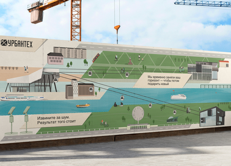 Чтобы деконструировать пространство, я сперва изучила карты и материалы, а затем отправилась в исследовательское путешествие в Нижний Новгород, чтобы пройтись по маршруту канатки. Поняв и засняв среду, я смогла придумать для нее такое графическое решение, которое бы не перегружало холст строительного ограждения и формировало внутренние правила размещения элементов.