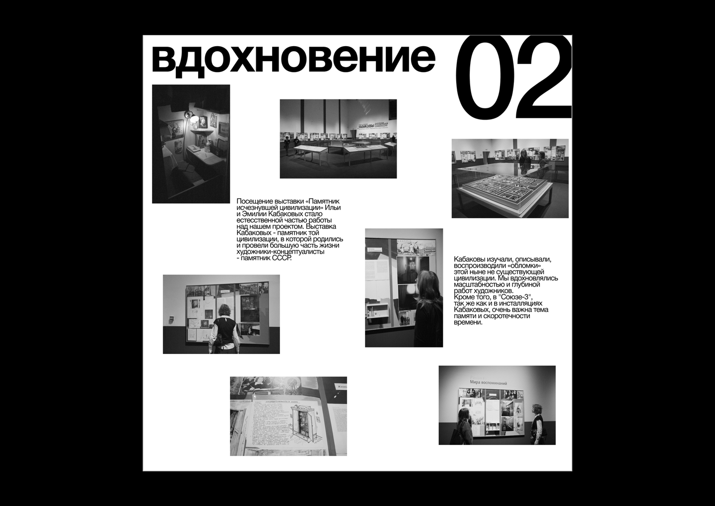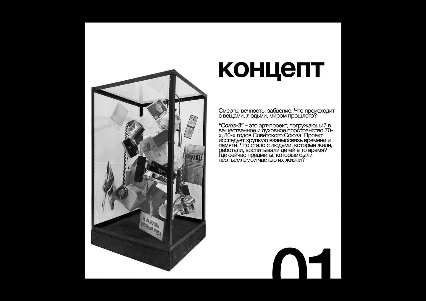 «Союз-3» — это арт-проект, погружающий в вещественное и духовное пространство 70-х, 80-х годов Советского Союза. Проект исследует хрупкую взаимосвязь времени и памяти. Что стало с людьми, которые жили, работали, воспитывали детей в то время? Где сейчас предметы, которые были неотъемлемой частью их жизни?