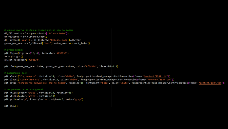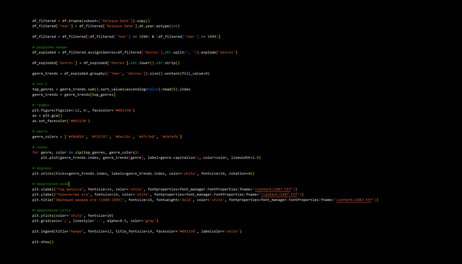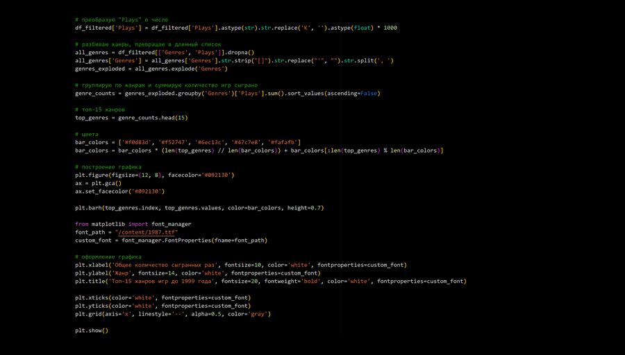 Были импортированы библиотеки pandas, numpy, matplotlib.pyplot и matplotlib.font_manager. Отдельно были подгружены датасет и шрифт в виде файлов.