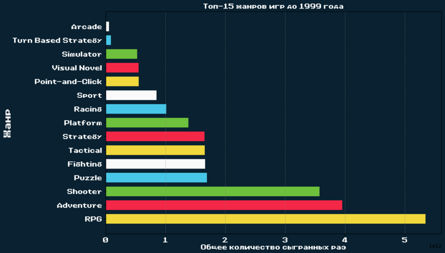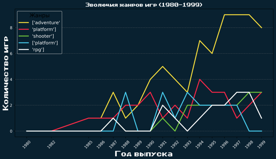 Такой график позволил понять, что наибольшую популярность со временем приобрел жанр приключений. А вот RPG и платформеры делали уже не так активно.