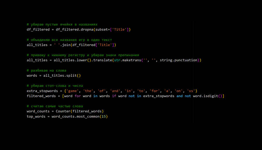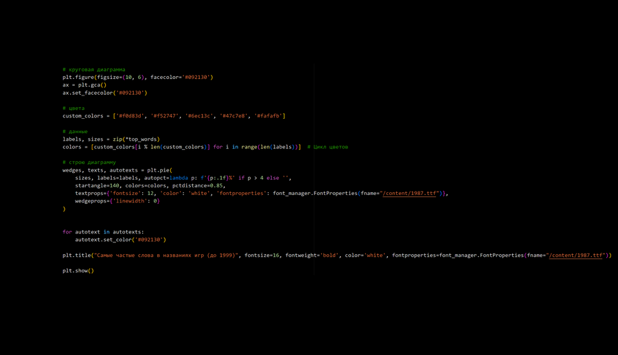 Ideogram — генерация обложки. Промпт: pixel art illustration of two retro game style characters fighting on a dark background. The characters have neon colors and simple icon style Chat GPT — помощь в дополнении и расширении кода, проверка кода, улучшение кода и устранение ошибок и опечаток (см. также экраны 8 и 18). Он также помог написать часть кода для диаграмм, где требовалась фильтрация слов и скачивание стоп-слов Upscayl — увеличение изображений Recraft.ai — генерация изображения для палитры. Промпт: pixel art illustration pattern of retro games icons in neon colors