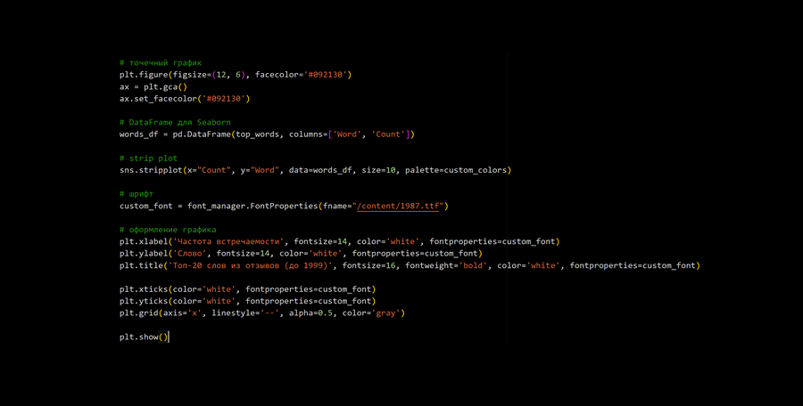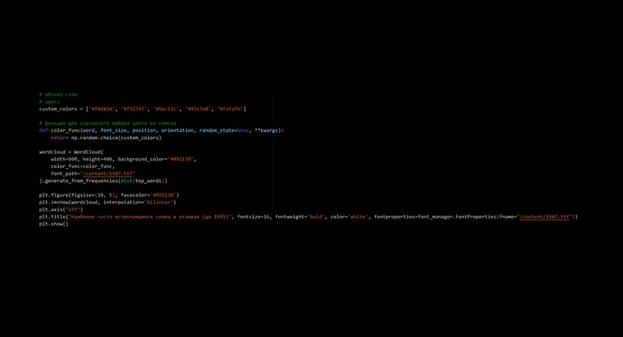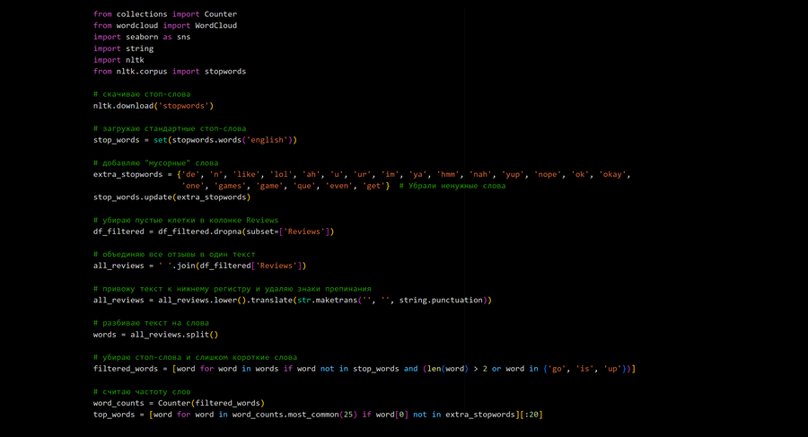 Мне захотелось проанализировать самые часто встречающиеся слова в отзывах и сделать для этого как график, так и облако слов. Для этого мне пришлось обратиться к ChatGPT, чтобы он помог мне избавиться от слов-паразитов, коротких слов, предлогов, местоимений и т. д.