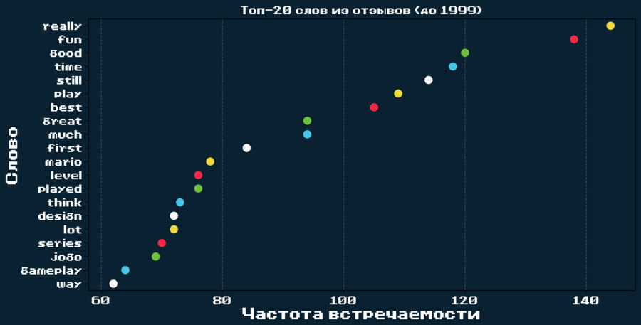 В виде точечного графика статистика становится еще более наглядной. Очевидно, что чаще всего такие игры находят веселыми и считают их идеальными для того, чтобы приятно занять свободное время. К Марио, кстати, повышенный интерес.