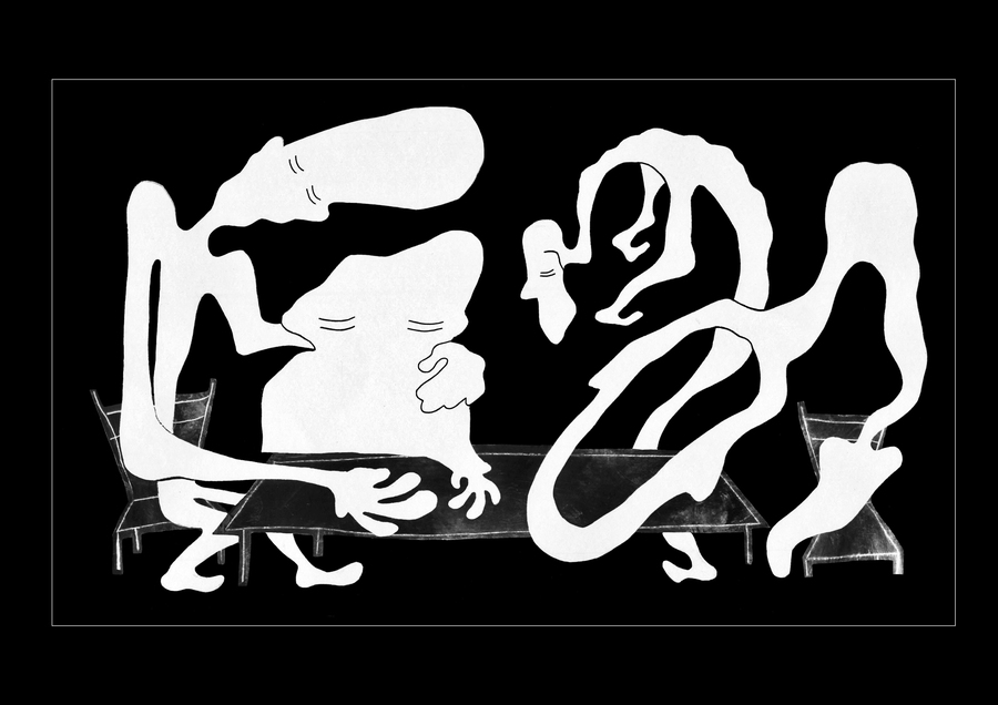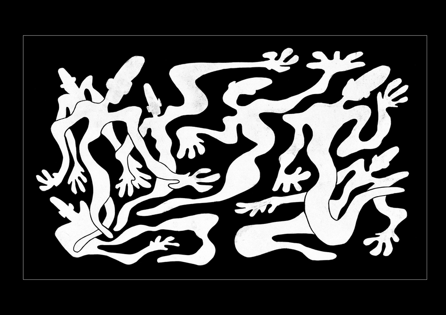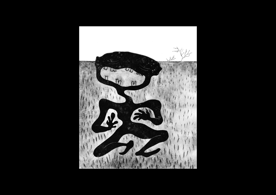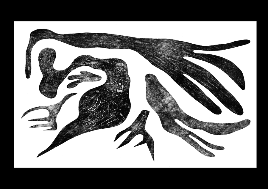 Юрий Мамлеев является родоначальником метафизического реализма. Его андерграундный роман «Шатуны» был опубликован в 1966 году. Моим итоговым проектом является иллюстрирование и дизайн этого романа. Я целиком переработал его визуальную репрезентацию: изменил верстку, превратил номера глав в полноценнные композиционные состовляющие, сделал обложку и 16 иллюстраций в технике печатной графики.