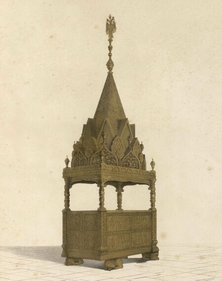 Царское место — «Мономахов трон» в Успенском соборе Московского Кремля. Копия-реконструкция (1895–1909 гг.) и фрагмент панели.