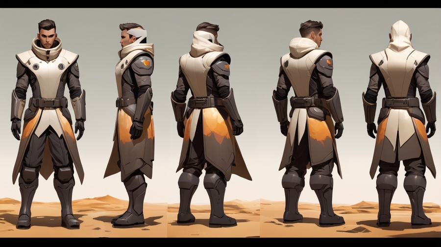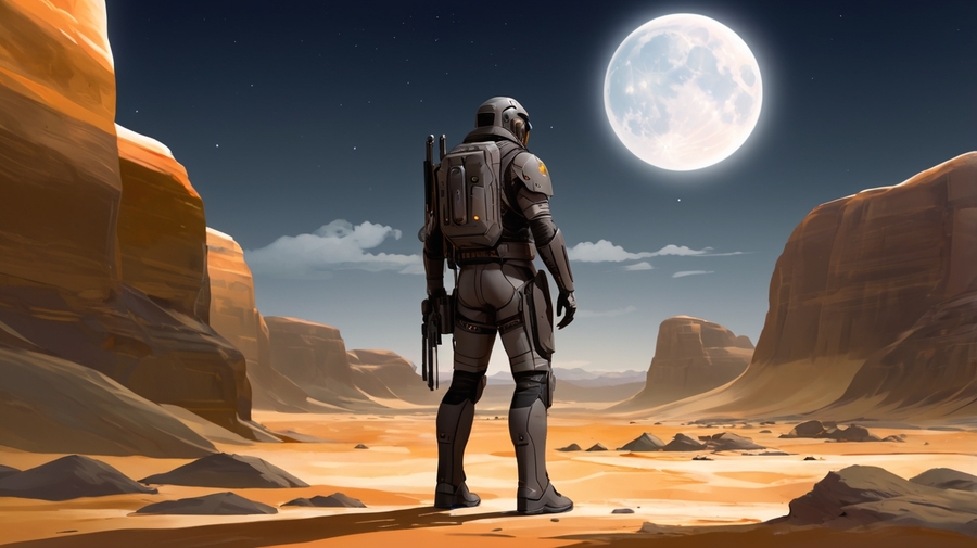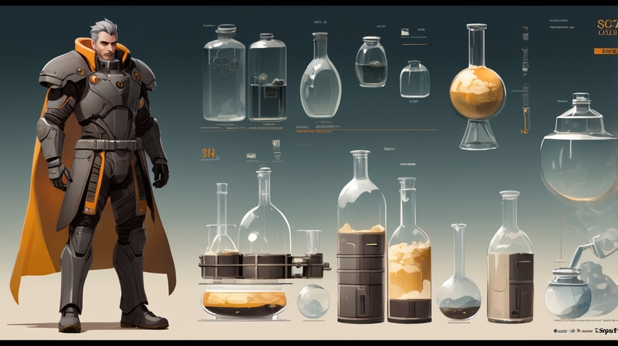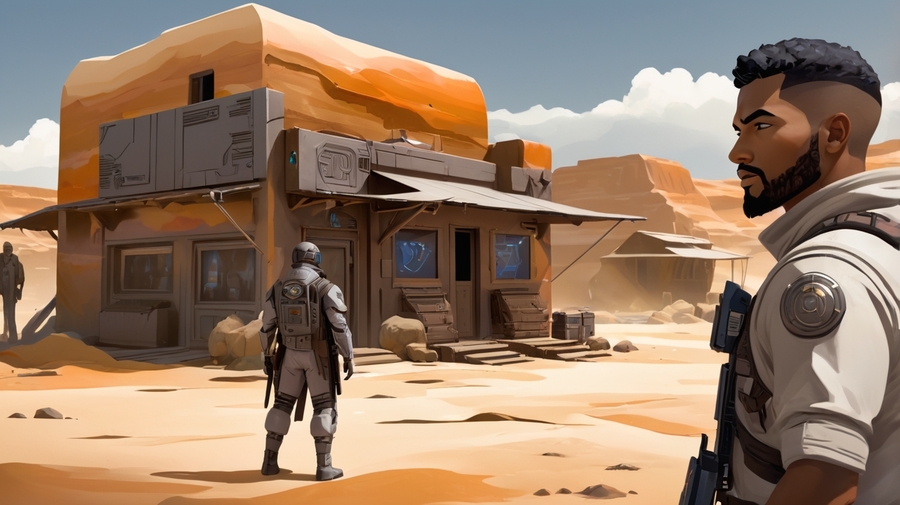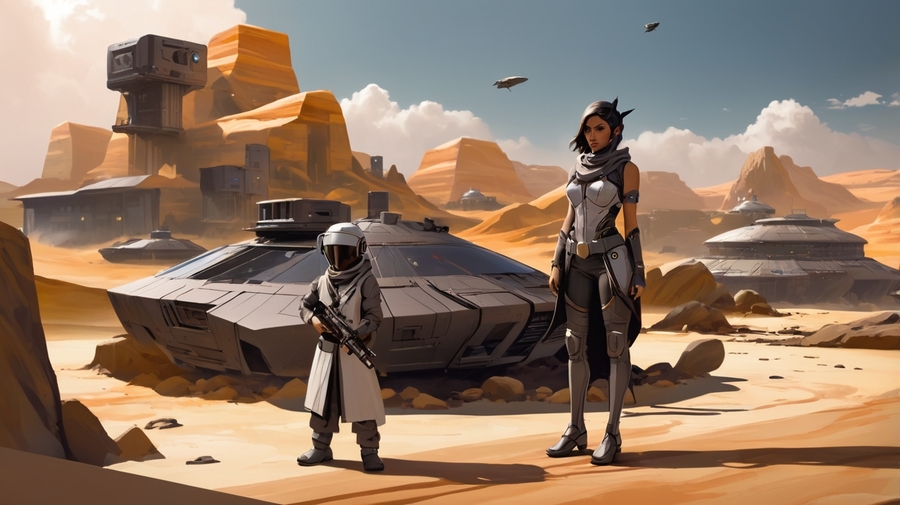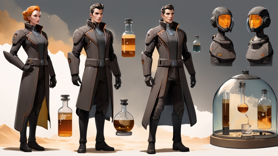 Модель: Leonardo.Ai Стиль: Concept Art Промпты: «Small sci-fi town in desert, characters in the environment, daylight»; «Desert sci-fi landscape in a night time, characters in the environment»; «Sci-fi character design among chemical flasks»