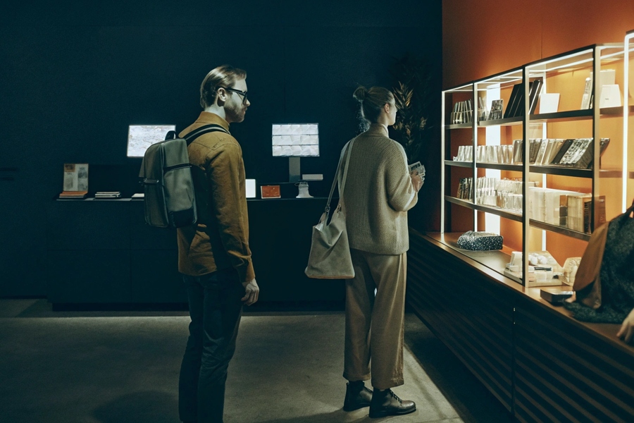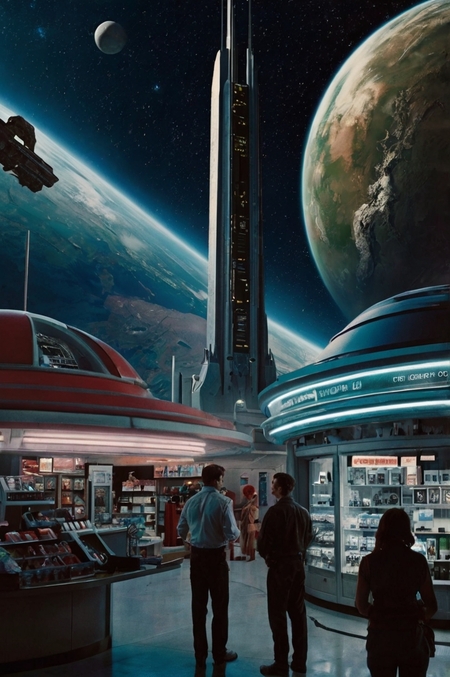 Модель: Recraft.ai Стили: Urban Drama, Retro Realism, Evening light Промпты: «Create a photo inside a gift store in blue and orange colors in futuristic style», «Create a photo inside a modern merchandising shop in blue and orange colors in futuristic style»