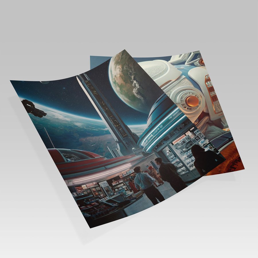 Во время создания постеров, а также других плакатов, которые будут далее продемонстрированы в разделе «Промо-материалы» использовалась модель Leonardo.Ai. Стиль: Cinematic Kino Промпты: «Make a gift store sci-fi poster», «Make a sci-fi poster with a product», «Make a sci-fi poster with a person in futuristic glasses»