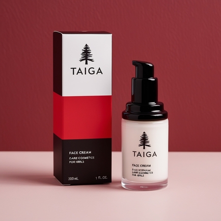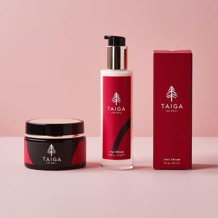 Сгенерировано в Leonardo Ai промт: develop a beautiful and elegant packaging design for care cosmetics for girls consisting of cream and serum for the face with a minimalistic design with the TAIGA logo. the palette is red and black, the bottle is transparent, the shape is elegant