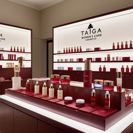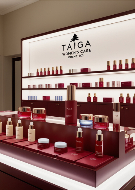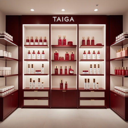 Интерьер фирменного магазина. Сгенерировано в Leonardo Ai промт: space of the TAIGA women’s care cosmetics store. The design is minimalist and elegant, serums and face creams are laid out on shelves and racks, the lighting is dim and the store has a pleasant, elegant atmosphere, the color palette of the products consists of red, white and a little blue.