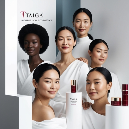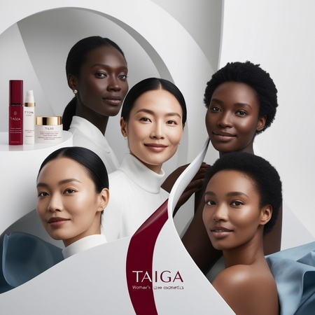 Сгенерировано в Leonardo Ai промт: carriers of the brand of women’s care cosmetics TAIGA. The design is made in a minimalist elegant style in a color palette of red, white and a little blue