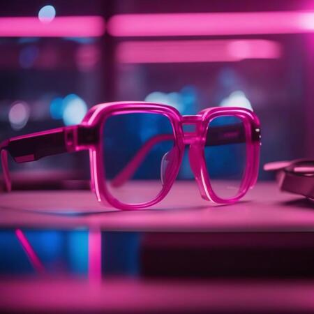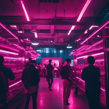 4. At the factory, a crowd of Chinese are using halograms to produce super modern glasses. Cyberpunk style. Pink and dark blue color palette.