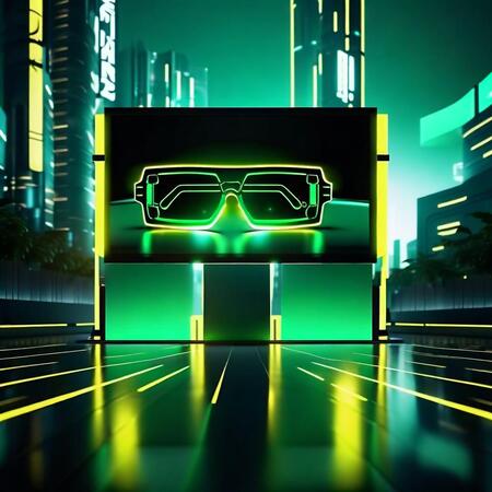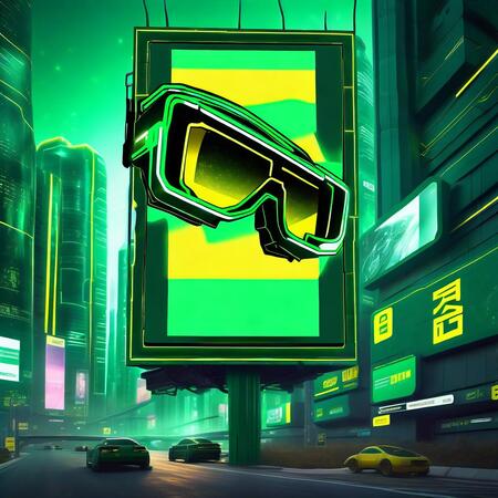 8. Billboard in a city of future with modern dark green with yellow glowing details glasses in cyberpunk style on it
