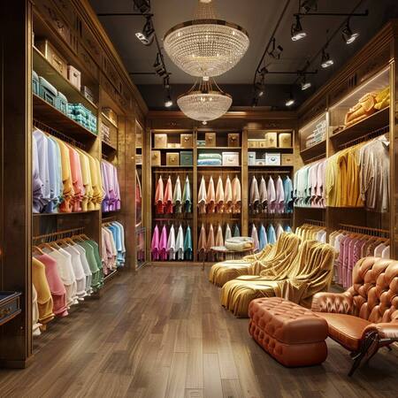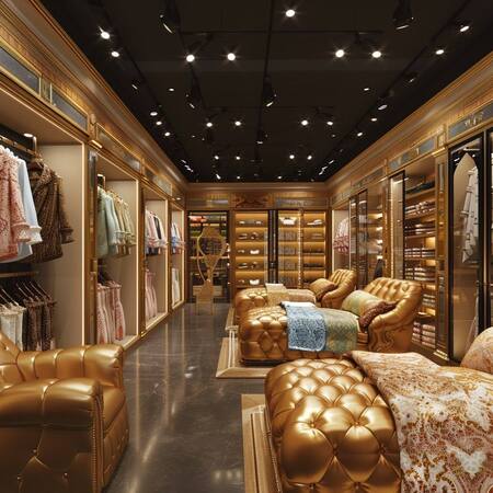 Промпт: 3D image of a large store with sleep items, mostly in gold tones, the store has leather chairs for customers, pajama clothes of various colors are hung along the walls. The store looks memorable, but at the same time calming.