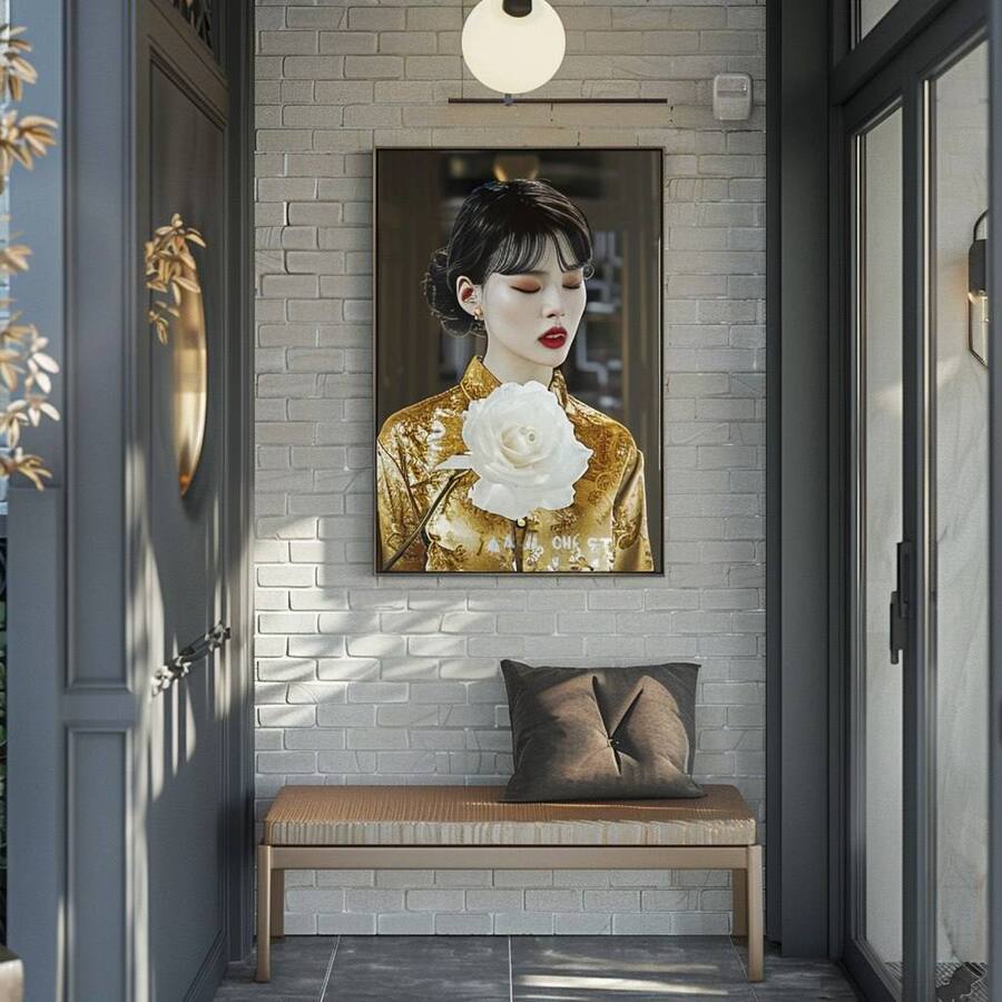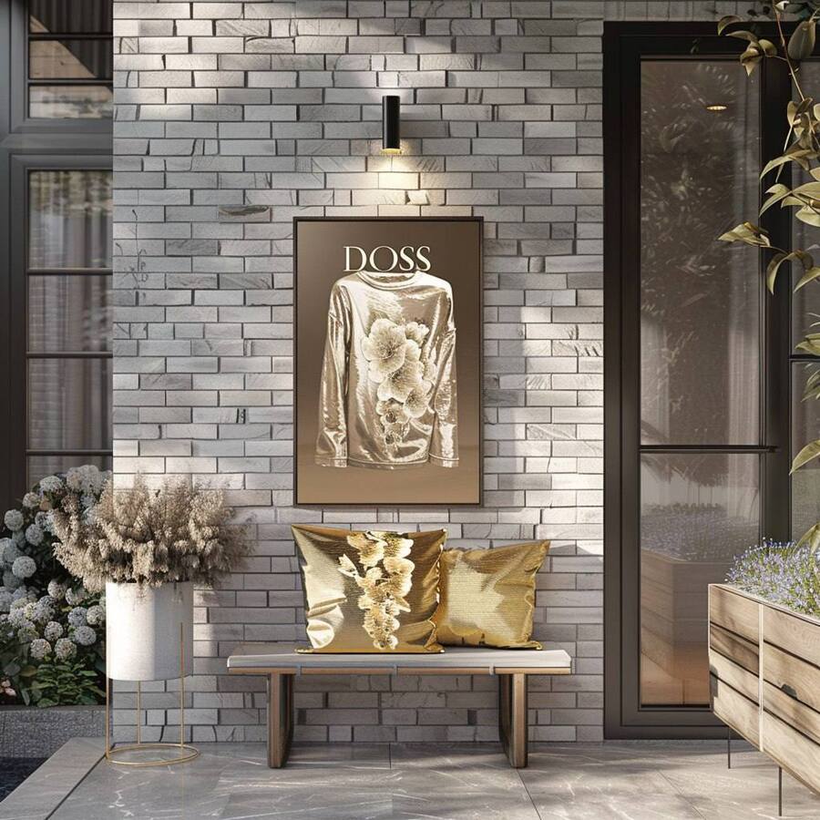Промпт: 3D image of a beautiful white poster hanging on a gray brick wall of a house. The poster depicts a beautiful girl dressed in a gold pajama shirt. The shirt has white roses as an image. The poster also says DOSS — all for you.