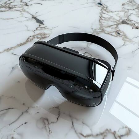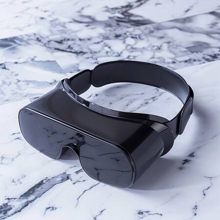 Промпт: 3D image of black VR glasses. They are lying on a large white marble table.