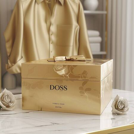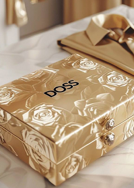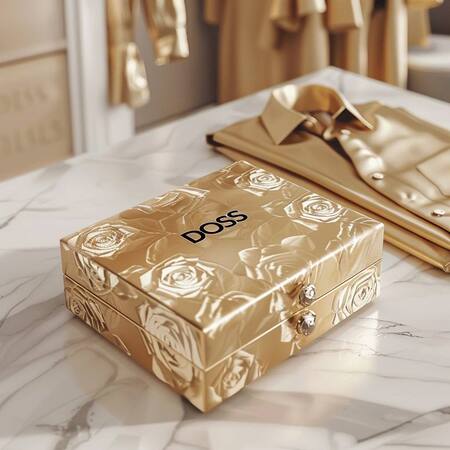 Промпт: 3D image of an elegant minimalist gold box made of expensive cardboard. On the top of the box is written DOSS in black grotesque font. The box is on a white marble table. In the background you can see a beautiful folded gold shirt with white roses depicted on it.