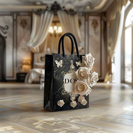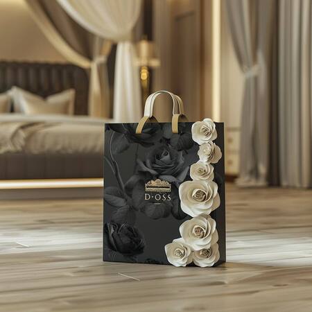 Промпт: 3D image of an elegant black paper bag with a texture of white roses as decoration. The package has a grotesque DOSS inscription in the center. The package itself is on the floor in a luxurious room. The floor is made of light wood, in the background there is a large bed with a golden canopy.