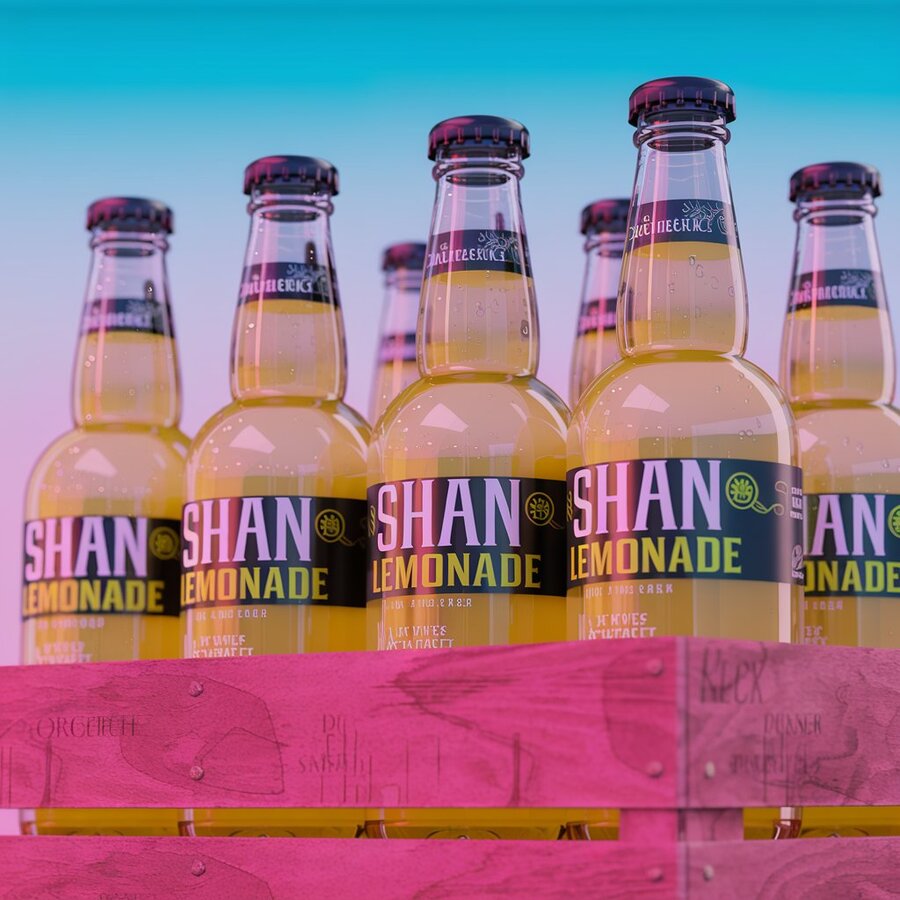 /imagine prompt: create a package of cold Ingush lemonade «SHAN». Looks like a glass bottle with lemonade in yellow shades, packages for different tastes. All bottles lie on the grass or in the mountains.
