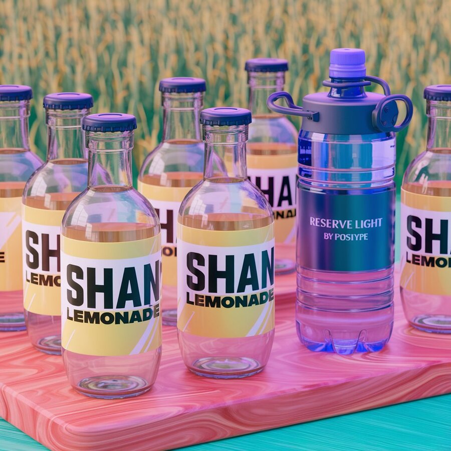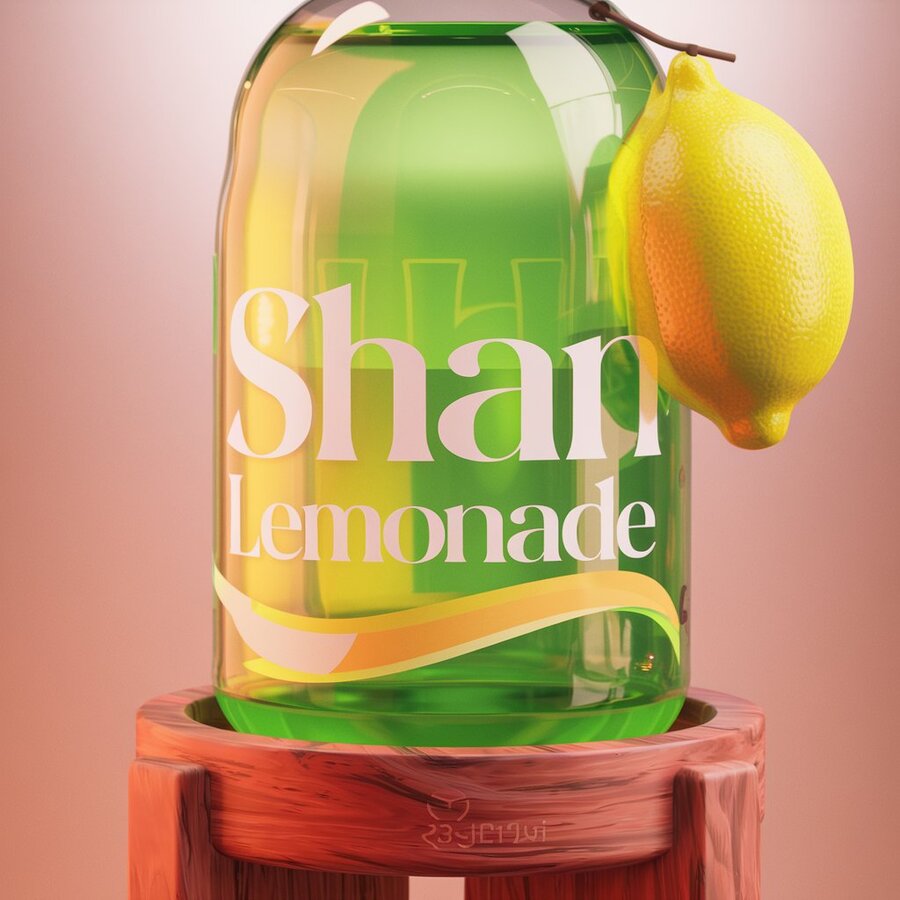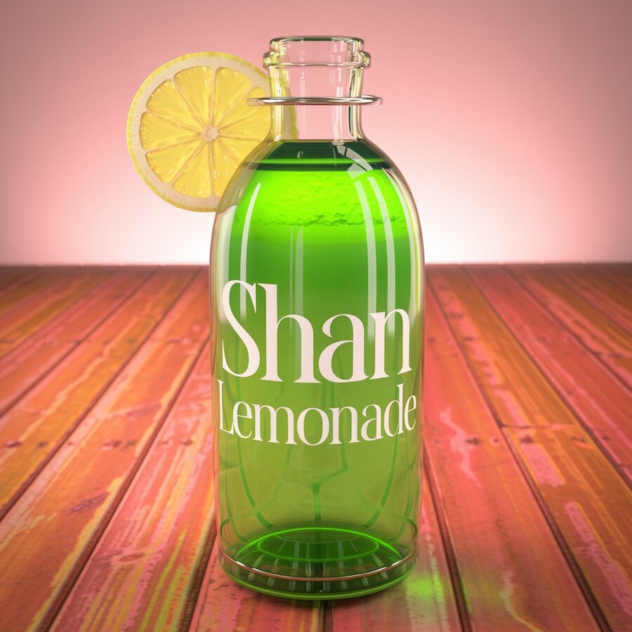 1. /imagine prompt: generate design 3d render of glass drinks lemonade bottles models as a merch for the SHAN lemonade drinks the font is Reserve Light by Positype water brand which is inspired ingush brand with ingush ornament, using bright yellow and white colors and black colors on yellow