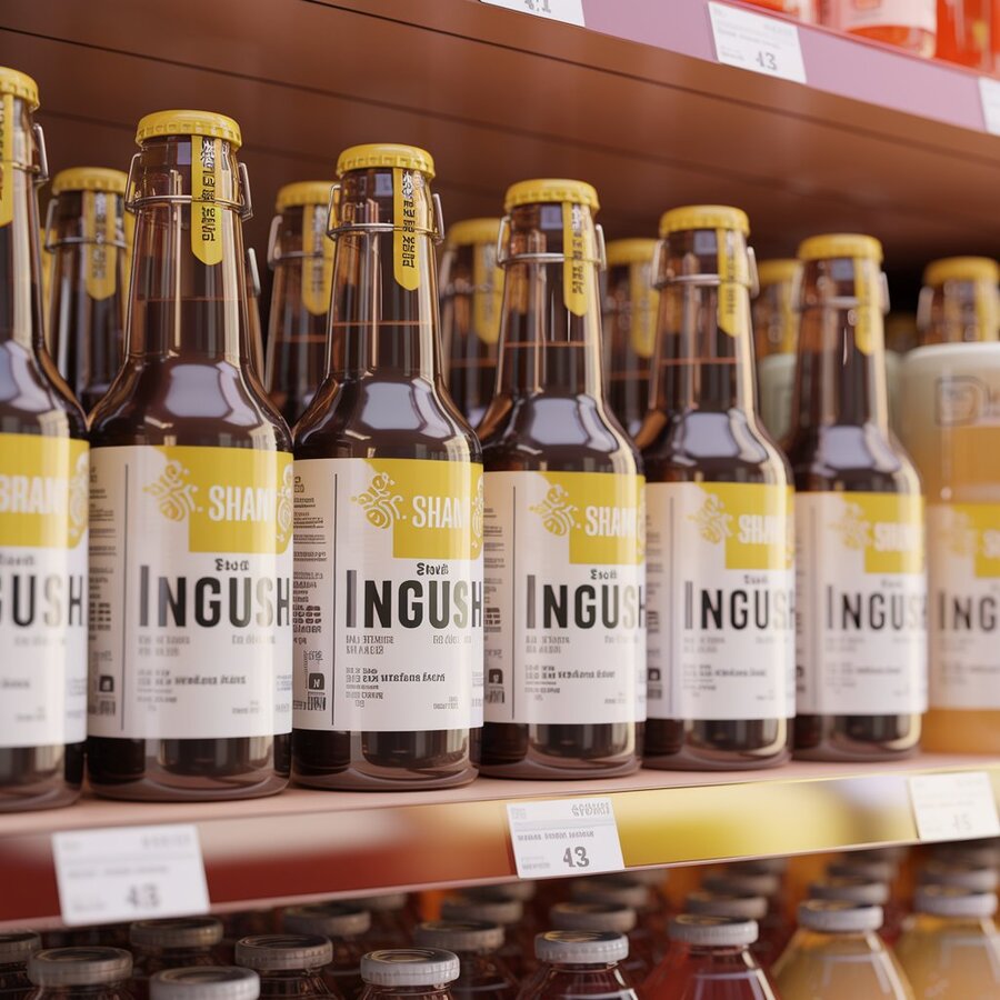 1. /imagine prompt: A 3D render of SHAN brand ingush drinks bottles displayed on a supermarket shelf. The bottles have a modern design with ingush ornaments yellow and white labels. The bottles are positioned alongside other products. The overall atmosphere of the image is warm and modern 2. /imagine prompt: generate design 3d render of glass drinks lemonade bottles models as a merch for the SHAN lemonade drinks the font is Reserve Light by Positype water brand which is inspired ingush brand with ingush ornament, using bright yellow and white colors and black colors on yellow Less