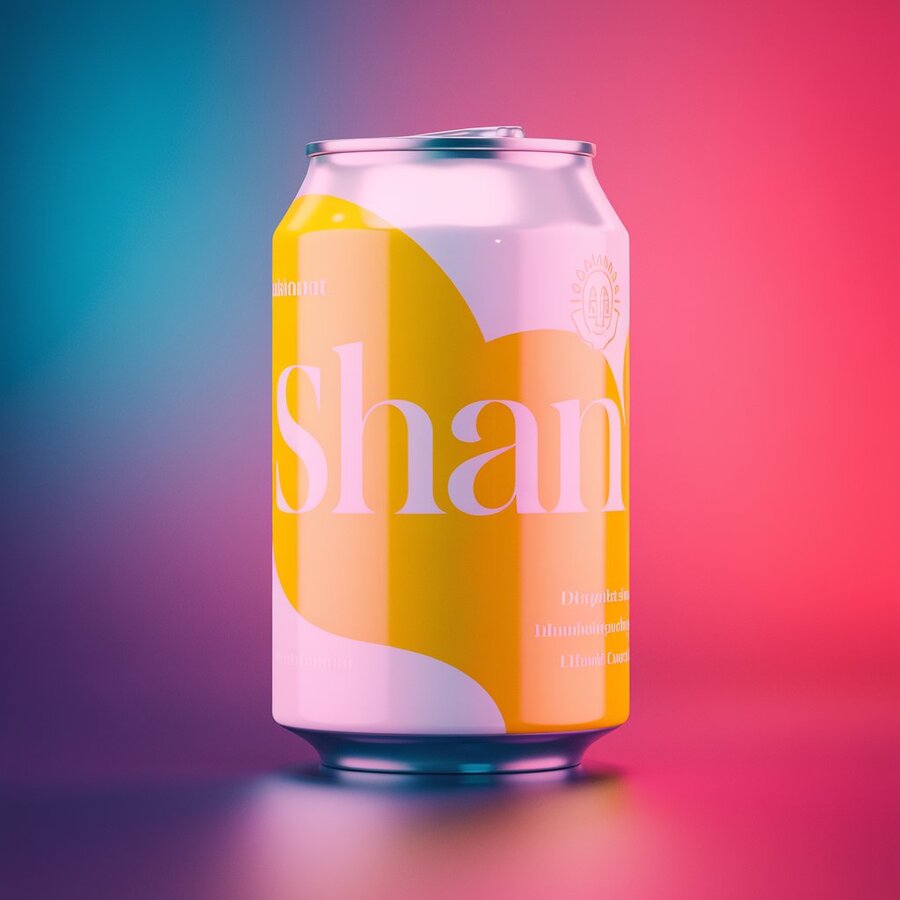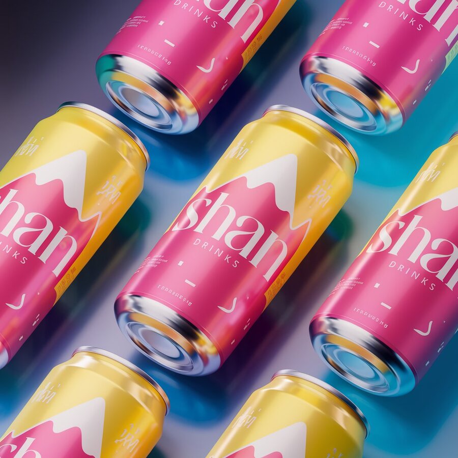 2. /imagine prompt: generate design 3d render of cans drinks lemonade models as a merch for the SHAN lemonade drinks the font is Reserve Light by Positype water brand which is inspired ingush brand with ingush ornament, using bright yellow and white colors and black colors on yellow