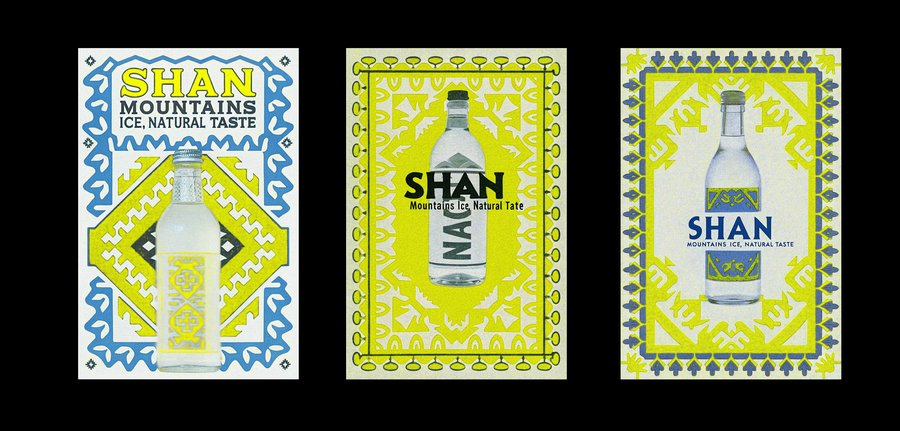 /imagine prompt: posters for the Ingush lemonade brand SHAN hang on the wall. On poster bottles lemonade, fruits, ingush geometry ornament and mountains. The posters background is Ingush geometry ornament and textures. The poster is printed on high-quality paper, with bold typography stating 'SHAN — mountains ice, natural taste'.