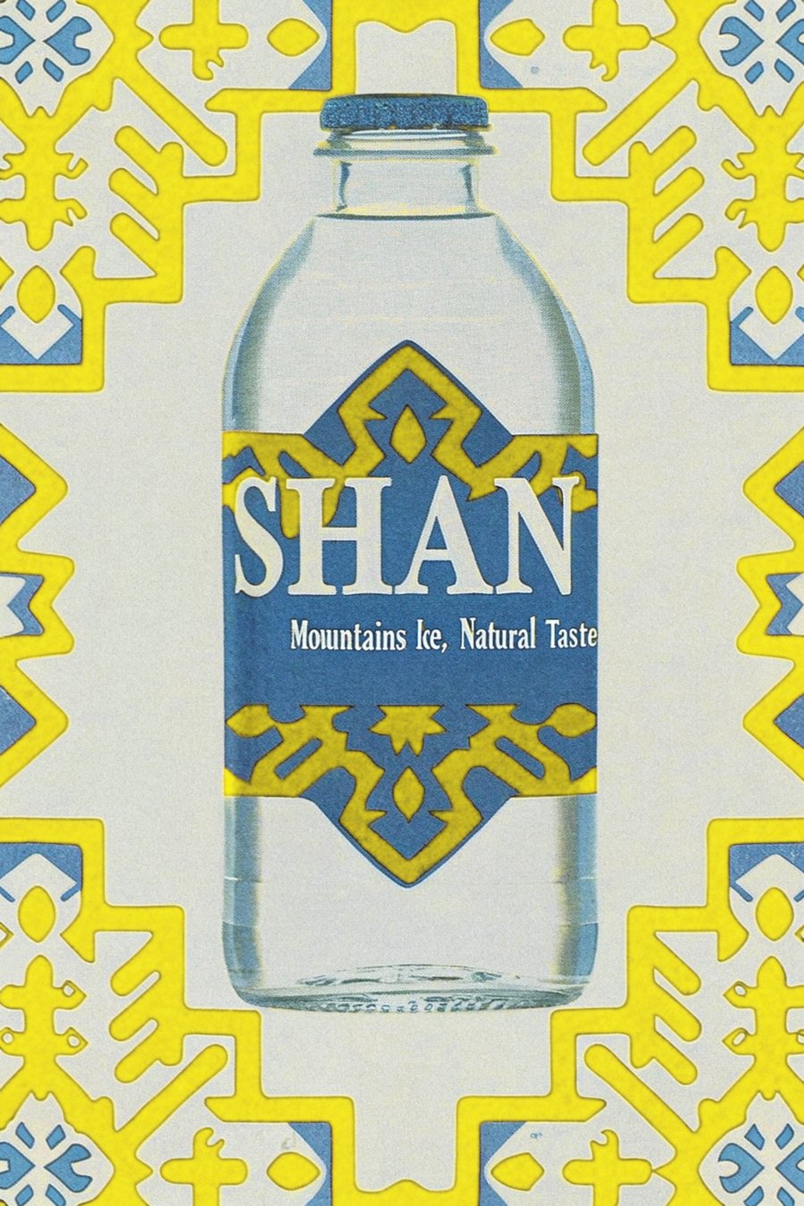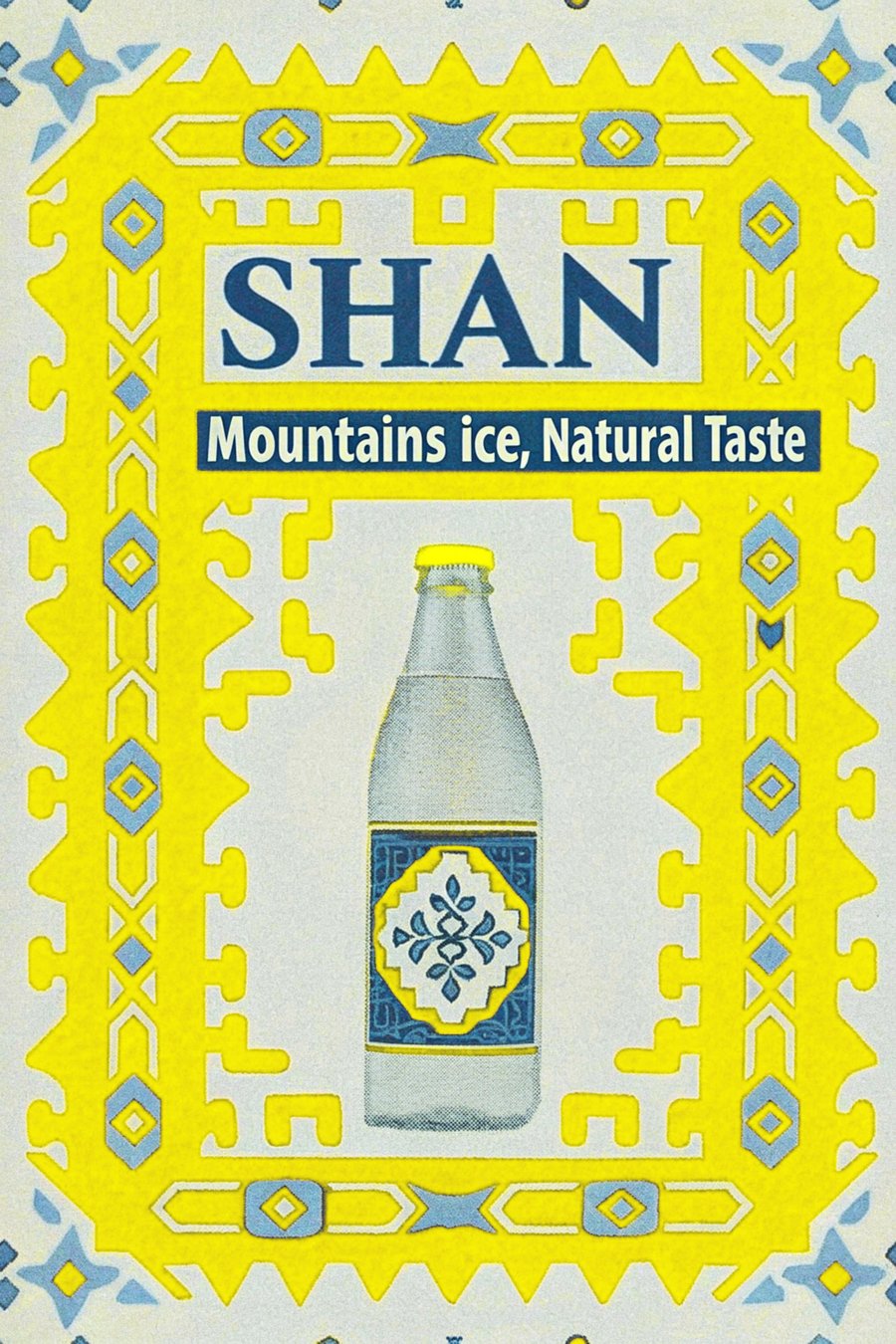 /imagine prompt: A captivating ingush-inspired advertising poster for SHAN drinks. The photo features a glass bottle of SHAN lemonade bottle. The background is ingush geometry ornament and textures. Yellow, black, blue and white colors. The poster is printed on high-quality paper, with bold typography stating ’SHAN — mountains ice, natural taste’.