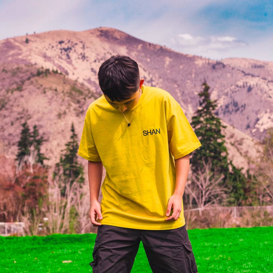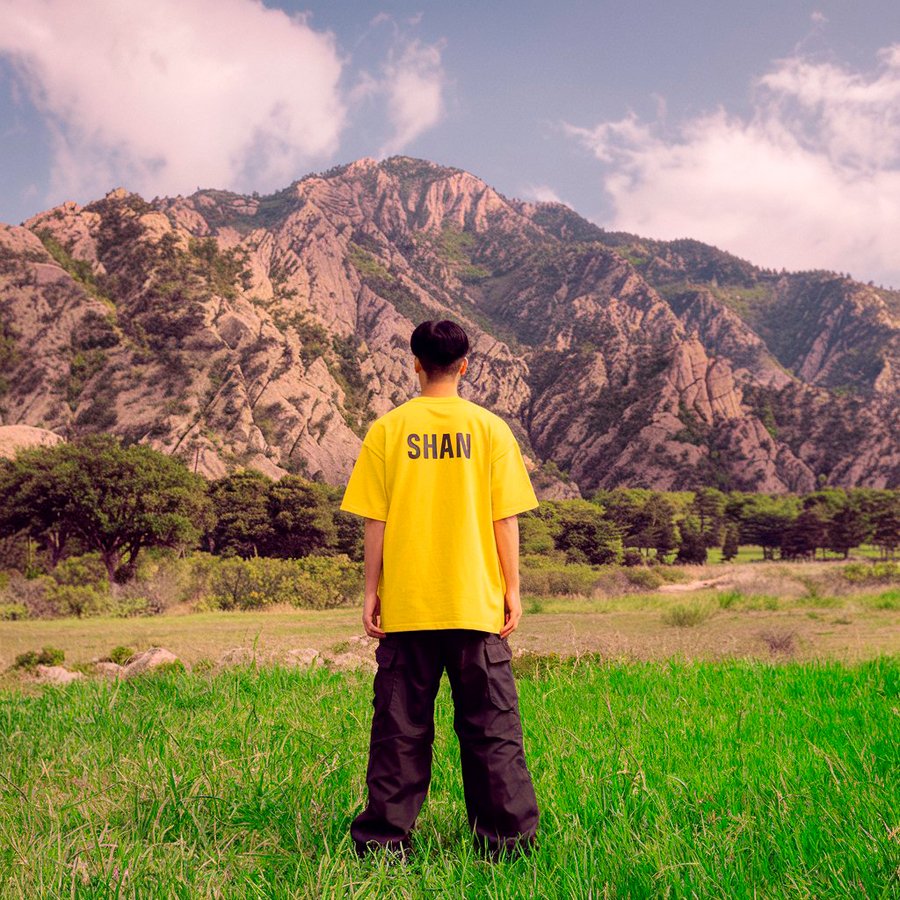 2. /imagine prompt: сreate a design for a yellow men’s T-shirt for the Ingush drinks brand SHAN, which will be depicted on a person. The T-shirt says «SHAN» and he is standing on the grass with mountains in the background. Fashion photography for promo without a face.
