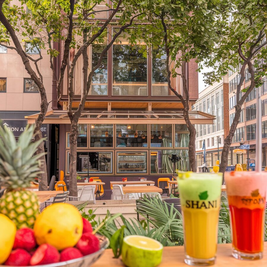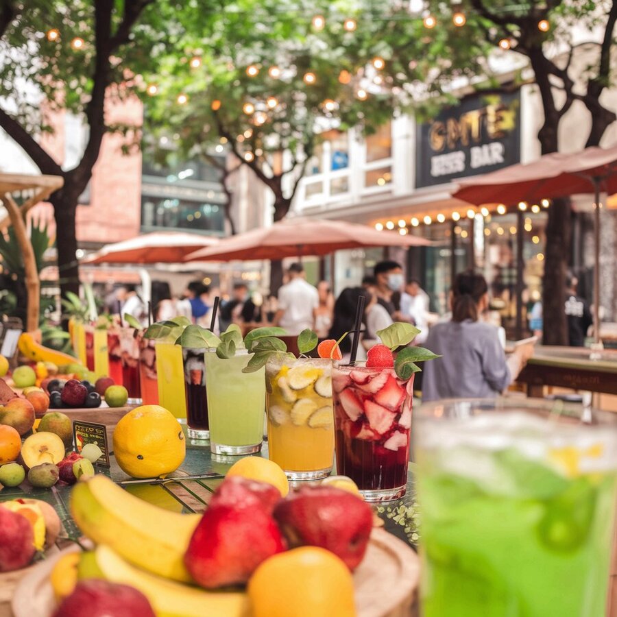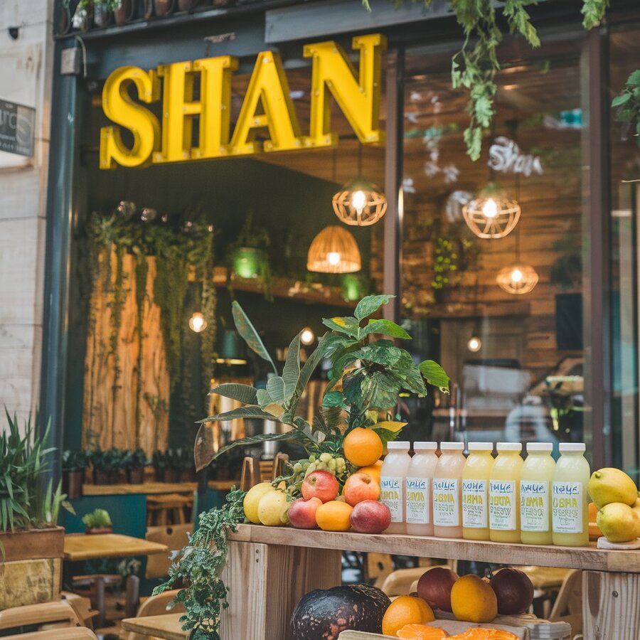 1. /imagine prompt: cafe or a bar facade with some open air in the city centre for SHAN ingush drinks from fresh fruits. there is a natures atmosphere and a lot of wood and light. people can see a lot of fresh fruits and the whole product. 2. /imagine prompt: A photo of a café or open-air bar in the center of a city, serving Inguish beverages SHAN made from fresh fruits. The atmosphere is nature-oriented, with lots of trees and light. People can see a lot of fresh fruits and the entire product.
