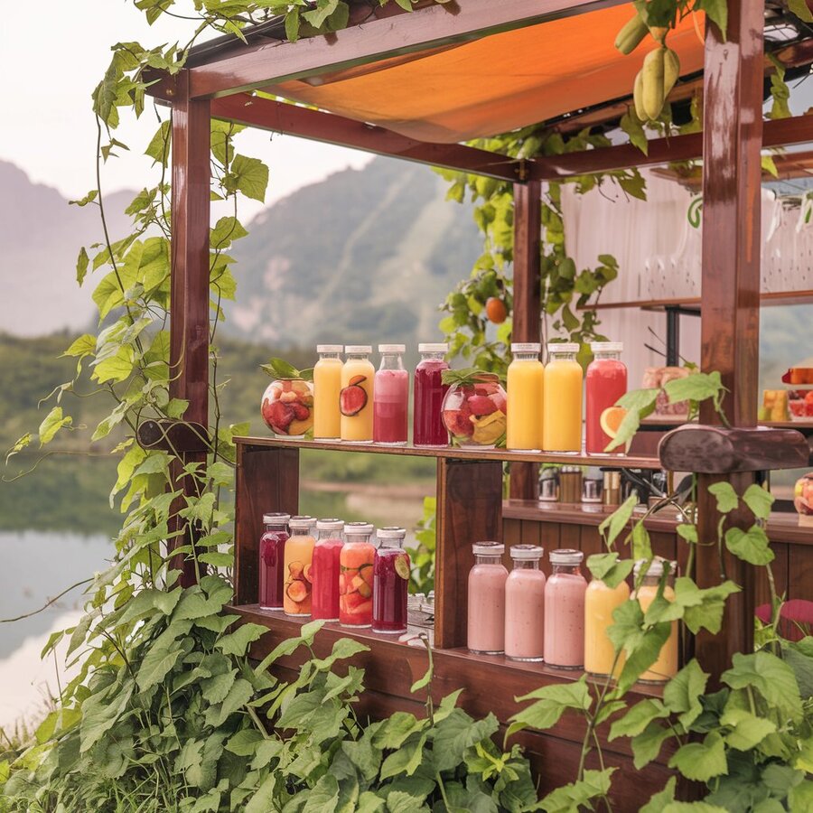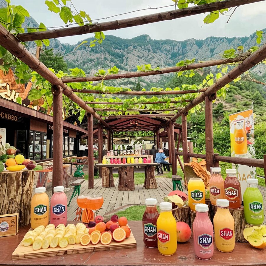 /imagine prompt: promotional area on the mountain with Ingush drinks «SHAN» made from fresh and natural fruits. There is an atmosphere of nature here, a lot of wood and vines.